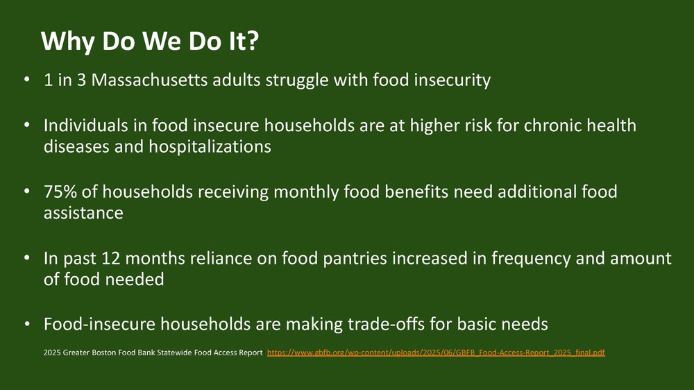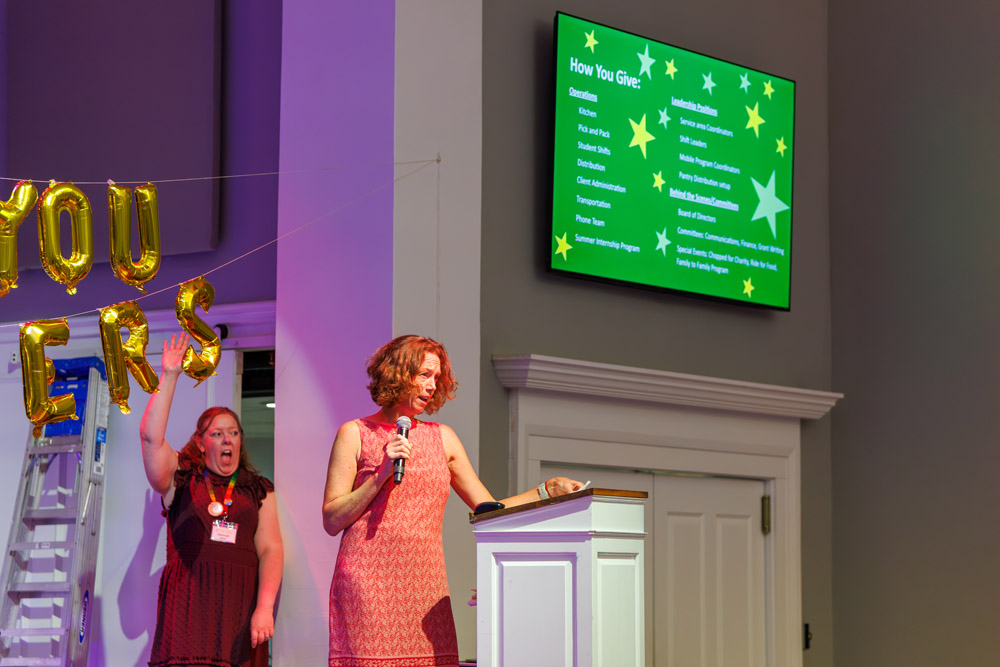 Two other volunteers who were unable to attend the event but were recognized are Peter Rally, who regularly does daily double shifts on distribution, and Deb Roussell, who works in the kitchen and serves as a shift leader for our Tuesday senior hour distribution.