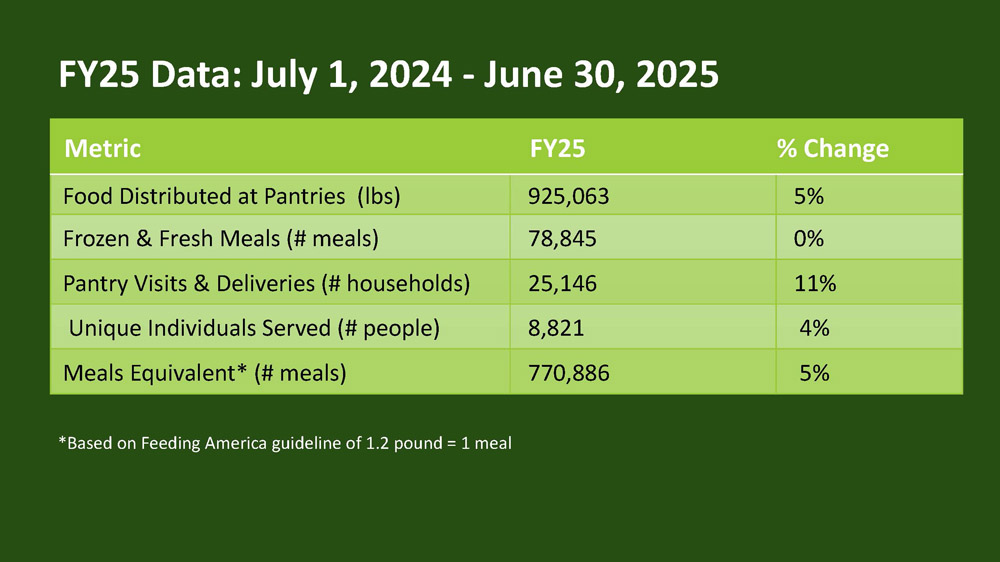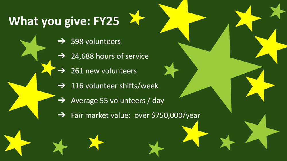We have SO many hardworking, enthusiastic, and helpful volunteers that it is always difficult to pick just a few to highlight. This year, we recognized several individuals who, in Fiscal Year 25, according to CERVIS, worked 200 or more hours in on-site pantry operations. These are volunteers who signed up for shifts, logged in, and worked directly in the pantry. We also know that many others dedicate countless hours to other aspects of our operations, both on-site and behind the scenes, and every hour our volunteers give is deeply valued.